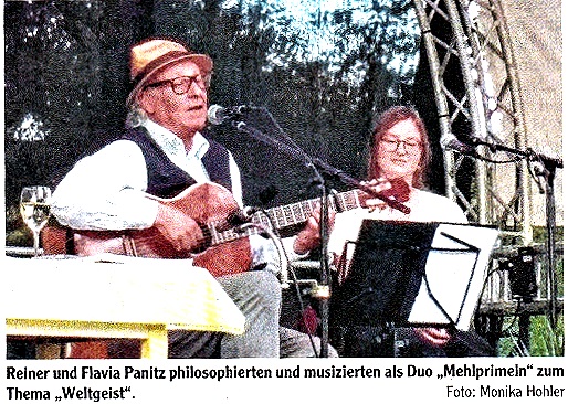 Rain Wer Reiner Panitz kennt, der weiß um die Hintergründigkeit seiner Kabarett-Beiträge und den weiten Horizont seines Programms in Wort und Musik. Und wer beim „1. Rainer Kultur- & Sommerevent“ zum ersten Abend in der Leutnantschanze gekommen war, fand im Programm „Weltgeistfunken“ nach der pandemiebedingten Zwangspause den einen Teil der Mehlprimeln in seiner unnachahmlichen Art. Nach dem Tod seines Bruders Dietmar rückte nun Reiners Tochter Flavia in das Duo nach. Ihr ererbtes musikalisches Talent bewies sie in Rain vor allem am Hackbrett.