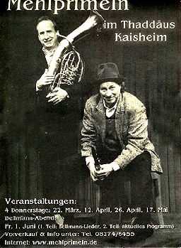 Der Barocksaal ist auch die „Heimatbühne“ der Mehlprimeln. Ihre Programme im Fasching, zu Ostern und am Muttertag sind nach wie vor eine höchst vergnügliche, absurde Mixtur aus virtuoser Instrumentalmusik und Bellman-Liedern, aus Witz und Sarkasmus, Poesie und Parodie, Wahnsinn und Chaos, Spottgesängen und Volksmusik, Literatur und Nonsens mit Niveau. Eine Mischung, die das Publikum immer wieder begeistert. Dazu kommen aktuelle Beiträge, die sich mit den politischen Auswüchsen, den modernen Medien und den Problemen einer alternden Gesellschaft beschäftigen. Als „work in progress“, wie Volker Pispers seine Auftritte seit einem Jahrzehnt bezeichnet, sind auch die Auftritte der Mehlprimeln eine ständig aktualisierte, wilde Mischung aus Altem und Neuem. Kein Abend ist wie der andere, und das Publikum bestimmt durch seine Reaktionen den Ablauf des Abends mit. Höhepunkt im Kleinkunstjahr ist die „Schöne, wilde Weihnacht“ der Mehlprimeln. Die Abende – begleitet von den Thürlesbergern oder dem befreundeten Geigenensemble Radosov aus der Slowakei – sind Kult im Thaddäus.
